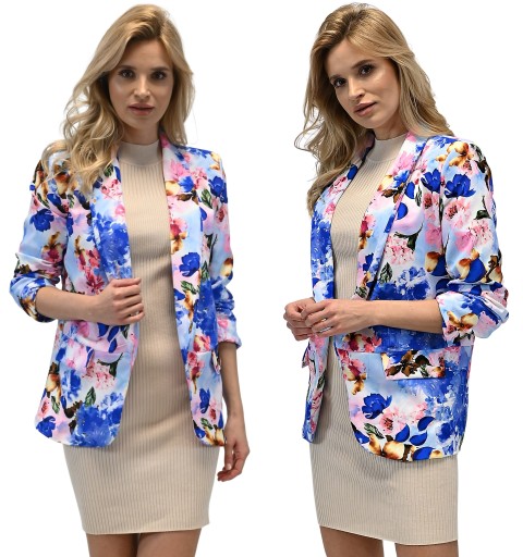 Wyjątkowa, modna, luźna marynarka w oryginalną kolorowy print kwiatów w nasyconej kolorystyce. Model dłuższy, smokingowy kołnierz Oryginalnego charakteru dodają drapowane rękawy o długości 3/4. Dwie kieszonki imitacje po bokach z efektownymi klapami upiększają marynarkę. Fason wyszczuplający z podszewką i miękkimi poduszkami w ramionach. Świetna jakość, perfekcyjne wykończenie!