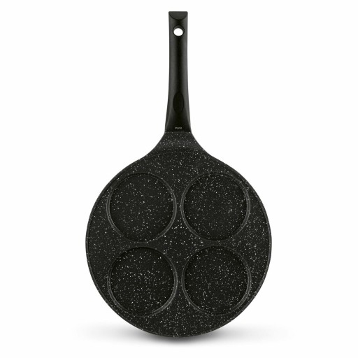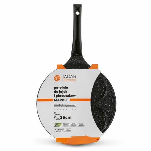 Patelnia marmurowa do pancakes i jajek sadzonych Tadar Marble 26 cm ma 4 miejsca na naleśniczki lub placki. Poprawisz więc estetykę posiłków w swoim domu. To doskonały pomysł na prezent. Wykonanie z odlewanego aluminium zapewnia jej trwałość. Powłoka non-stick wytrzyma wiele cykli ścierania. Możesz używać na niej mniej tłuszczu. Dania będą smaczniejsze i zdrowsze, a naczynie łatwo się umyje (do mycia ręcznego). Wolniej nagrzewający się uchwyt bakelitowy zapewni bezpieczeństwo użytkownikom patelni marmurowej do jajek sadzonych, pancakes, mini-naleśników i placuszków. Taka rączka dobrze leży w dłoni. Można na niej smażyć, stawiając model na kuchence ceramicznej, elektrycznej, gazowej i płycie indukcyjnej. Bez problemu poradzisz sobie z jej dokładną pielęgnacją i zaschniętymi resztkami ciasta.