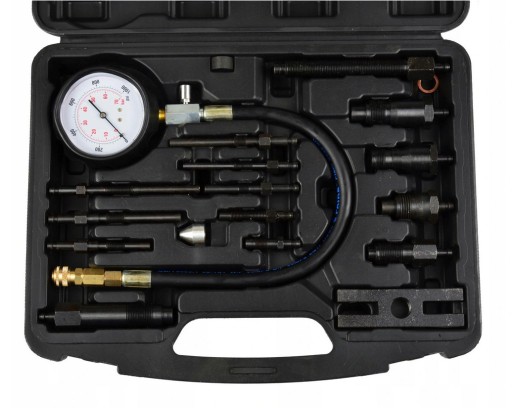 Przyrząd pomiarowy, zaopatrzony w szereg wymiennych końcówek, adapterów pomiarowych oraz zawór kontrolny. Zestaw umożliwia dokonanie pomiaru ciśnienia sprężania w cylindrach silników wysokoprężnych (diesla), maszynach rolniczych, generatorach itp.