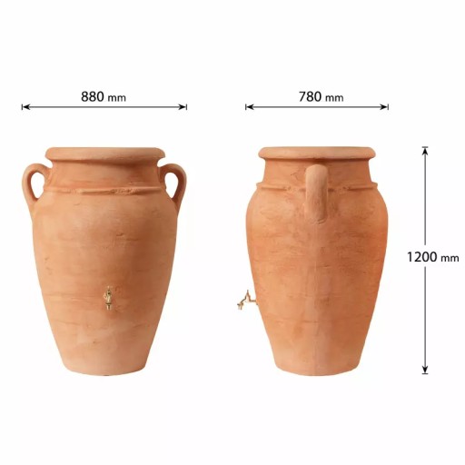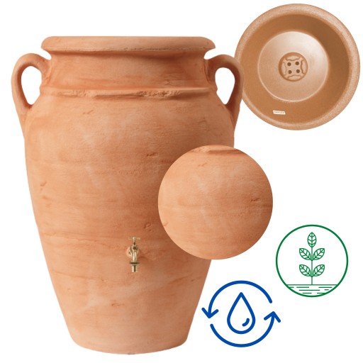 Zbiornik na deszczówkę AMFORA charakteryzuje się wyglądem przypominającym antyczną wazę. Świetnie sprawdzi się zatem jako ozdoba każdego ogrodu w klimacie śródziemnomorskim (ale nie tylko!), będąc jednocześnie jego praktycznym elementem. Pojemność zbiornika wystarczy do podlania małych i średnich rozmiarów grządek lub niewielkiego trawnika.