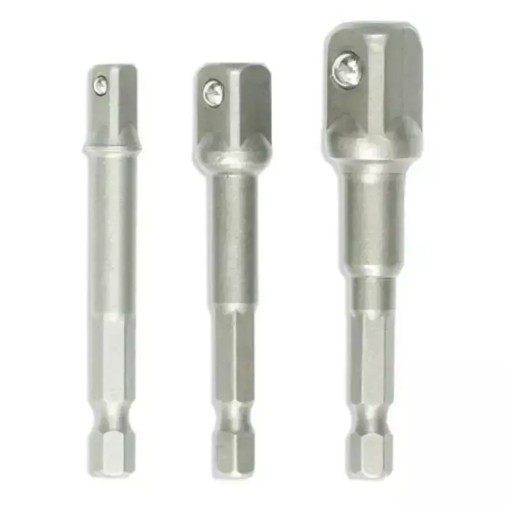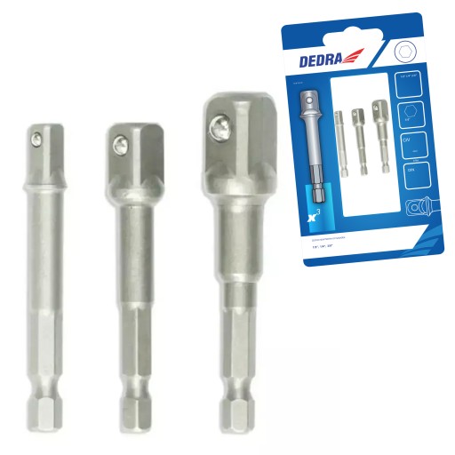 Zestaw 3 szt adapterów do nasadek o rozmiarze trzpienia 1/2", 1/4" oraz 3/8". Adaptery przystosowane są do pracy z wiertarko-wkrętarkami, wiertarkami oraz zakrętarkami. Adaptery wykonane z wytrzymałej stali chromowo wanadowej, która gwarantuje odpowiednią trwałość i odporność na korozje.