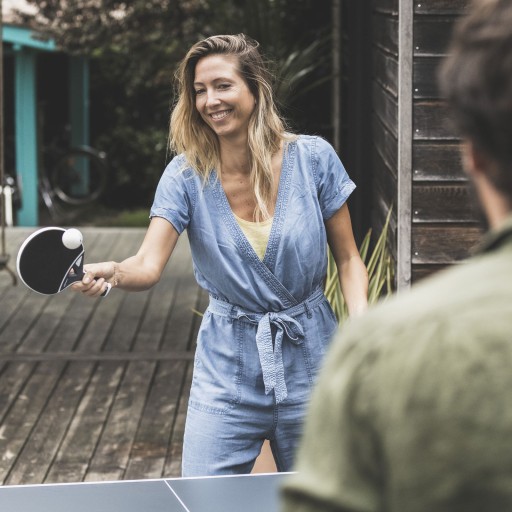 ALUMINIOWA RAMA: Aluminiowa rama w połączeniu z blatem daje grubość 55 mm i dzięki niemu jakość odbić dorównuje najbardziej profesjonalnym stołom. Wszystkie stoły do użytku zewnętrznego zapewniają gwarancję przynajmniej 10 lat dobrej zabawy.
