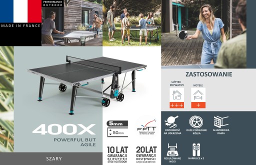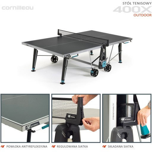 Dynamiczny wygląd 400X łączy w sobie klasę i nowoczesność. Projektanci zadbali o najmniejsze szczegóły, bazując na opinii klientów oraz własnym 50 letnim doświadczeniu. Eksperci z Cornilleau we Francji gwarantują przynajmniej 10 lat dobrej zabawy.