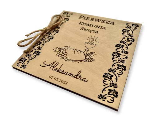 Książeczka zdobiona głębokim grawerem laserowym z podpisem " Pamiątka Pierwszej Komunii Świętej (IMIĘ DZIECKA + data Komunii Świętej) " (WZÓR OKREŚLONY wg. zdjęcia po lewej stronie).