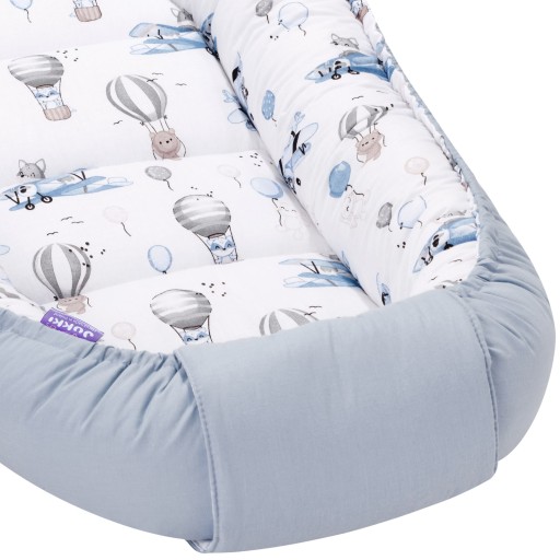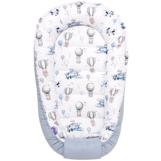 - Dwustronny kokon niemowlęcy o wymiarach zewnętrznych: 55 x 100 cm, wymiary powierzchni do spania: 30 x 70 cm, szerokość burty 14 cm,
