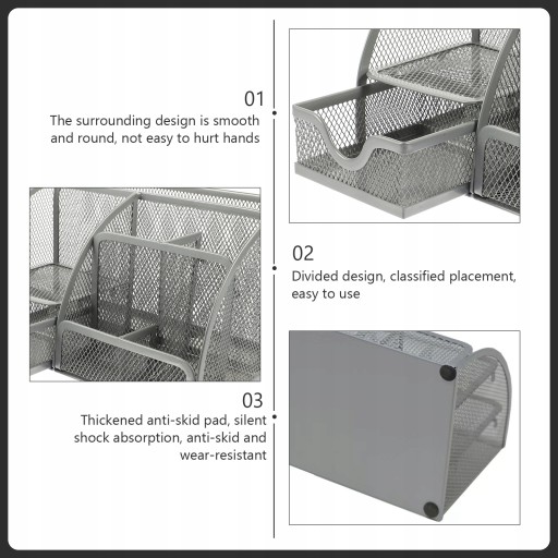 Pudełko magazynujące jest wykonane z żelaznego materiału metalu, z wykwintnym wykonaniem i długoterminowym użyciem bez deformacji. Projektowanie siatki, siedem klasyfikacji siatki, wszelkiego rodzaju linijki i małe przedmioty są wyraźnie umieszczone. Zagęszczona podkładka przeciw skupowi, wchłanianie cichej wstrząsu, przeciwnikowe i odporne na zużycie. Krawędź uchwytu pióra została wzmocniona, czyni go bardziej trwałą.