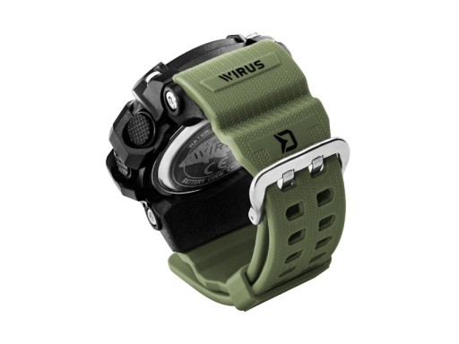Gumowy pasek jest wygodny w dotyku i można go dopasować, co oznacza, że zegarek idealnie dopasowuje się do każdego nadgarstka. Ciemnozielony pasek pasuje do otoczenia. Koperta zegarka jest czarna i solidna, o dużej odporności na zewnętrzne uszkodzenia mechaniczne.