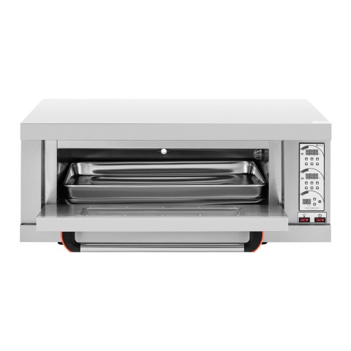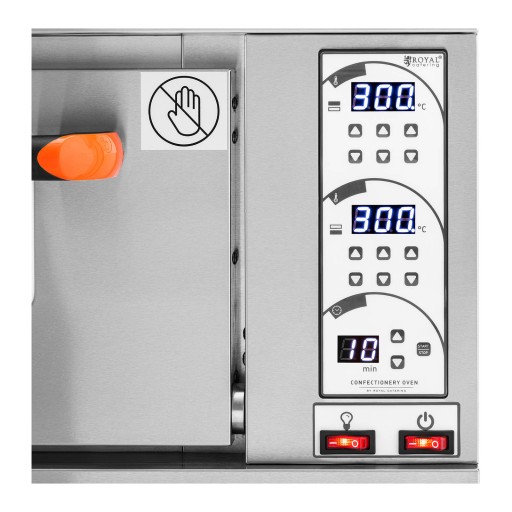 Obsługa pieca jest niezwykle prosta dzięki intuicyjnemu panelowi sterowania z czytelnymi wyświetlaczami. Pozwala on na ustawienie temperatury pieczenia do 300°C, oddzielnie dla grzałek górnych i dolnych, czasu pracy do 99 minut, czy też uruchomienie wewnętrznego oświetlenia.