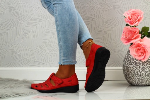 Ażurowe, półbuty damskie z wycięciami w kolorze czerwonym na niskim koturnie. Idealne na ciepłe dni. Sprawdzą się jako obuwie codzienne lub do pracy. Zapięcie na rzep ułatwia zakładanie. Wykonane z dobrych jakościowo materiałów. Miękka skórzana wkładka zapewnia komfort użytkowania. Prosty fason łatwo dopasuje się do wielu stylizacji.