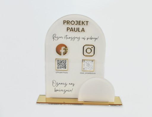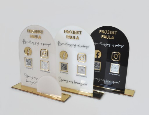 Tabliczka wykonana jest z wysokiej jakości plexi przeźroczystej o grubości 4 mm, zadrukowanej na kolor beżowy. Tworzona jest przy wykorzystaniu nowoczesnych technik cięcia laserem oraz druku UV. Dodatkowo statuetkę zdobią złote elementy z plexi lustrzanej o grubości 3 mm. Podstawka wykonana jest z plexi przeźroczystej oraz złotej. Całość tworzy elegancką kompozycję, która bez wątpienia zwróci uwagę Twoich Klientów i zachęci ich, by śledzili w social mediach Twój rozwój. Służy jednocześnie jako stojak na wizytówki.