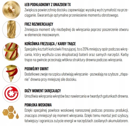 - Dzięki specjalnej powłoce woskowej nanoszonej podczas procesu produkcji, znacząco zmniejszyliśmy moment wkręcania. Dzięki temu montaż jest szybszy, łatwiejszy i ogranicza zużycie energii co jest szczególnie istotne w narzędziach zasilanych akumulatorem.