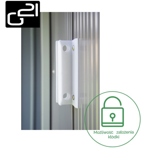 Częścią domku są przesuwne drzwi których zamontowana jest klamka/rączka z tworzywa umożliwiająca montaż kłódki. Założenie kłódki uchroni przed przypadkowym czy niepowołanym wejściem do domku.