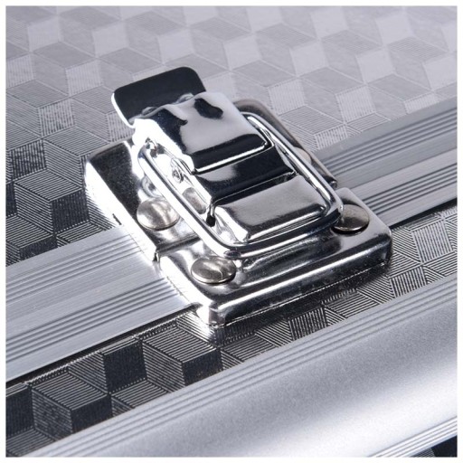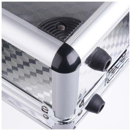 Neseser wykonany został z lekkiej, a jednocześnie ✅ bardzo solidnej i wytrzymałej drewnianej płyty MDF pokrytej srebrną nieprzemakalną okleiną z wytłoczonym na niej nowoczesnym wzorem. Posiada wygodny uchwyt, dwa zatrzaskowe, klamrowe zamki, gumowe nóżki na spodzie oraz jednym z boków, dzięki którym może stać lub leżeć płasko, a także jednostronnie otwieraną pokrywę. Krawędzie futerału zostały wzmocnione przez dodatkowe aluminiowe listwy i stalowe okucia.
