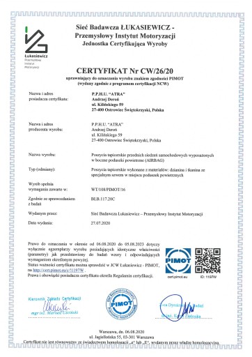 CERTYFIKAT AIRBAG NA BOCZNE PODUSZKI POWIETRZNE