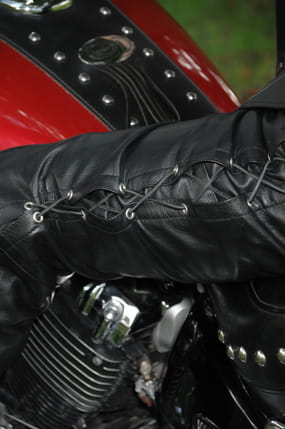 - Spodnie skórzane posiadają rzemyki po bokach umożliwiające regulacji szerokości nogawki