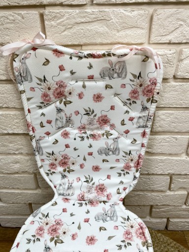 Wkładka posiada wycięcie na 5-punktowe pasy oraz na podusie "motylek", u góry wszyte są troczki, które ułatwiają mocowanie wkładki do wózka.
