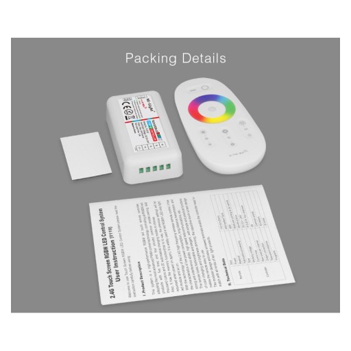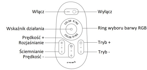 Pilot zasilany jest na 2 baterie 1,5V AAA (nie zawarte w zestawie), służy do sterowania barwą i natężeniem światła. Komunikacja ze sterownikiem odbywa się za pomocą fal radiowych RF, co ułatwia sterowanie - zasięg pilota dochodzi do 30m.
