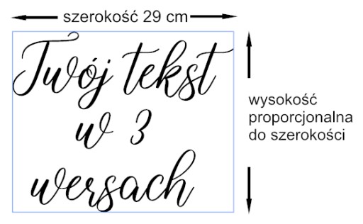Szerokość napisu: 29 cm, szerokość mierzona od lewej strony do prawej dla najszerszego wersu. Oznacza to, że każdy inny jest proporcjonalnie krótszy. Zachowujemy w ten sposób tą samą wielkość liter dla każdego wersu.