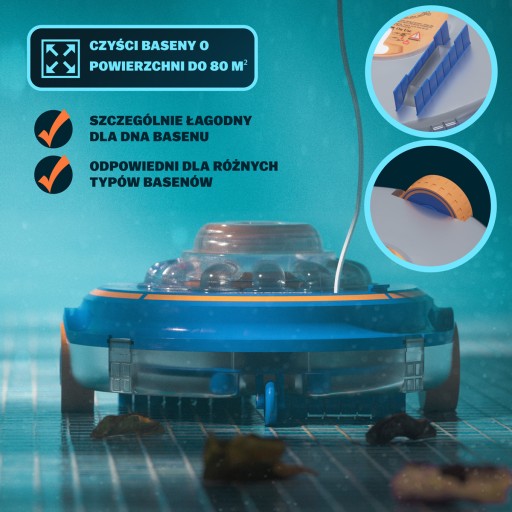 Bezprzewodowy odkurzacz basenowy działa tylko na ziemi - podczas czyszczenia możesz bez przeszkód pływać w basenie bez plątaniny kabli.