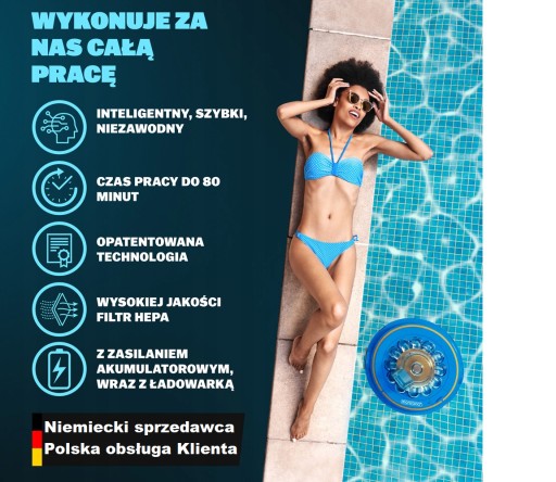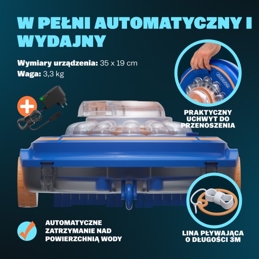 Gdy robot czyszczący zostanie wyciągnięty z wody, zatrzyma się automatycznie. Do czyszczenia filtra nie są potrzebne żadne dodatkowe narzędzia. Ładowarka, koła, wsporniki i filtry są dostępne jako części zamienne.