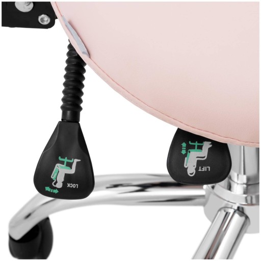 Siedzisko łatwo i szybko uregulujesz na wysokość 55-69 cm. Aby to zrobić, wystarczy nacisnąć dźwignię pod siedziskiem w odpowiednim kierunku. Siedzisko przesuwa się płynnie w górę/dół dzięki sprężynie gazowej. Solidny hoker kosmetyczny z oparciem wytrzymuje maksymalne obciążenie 150 kg.