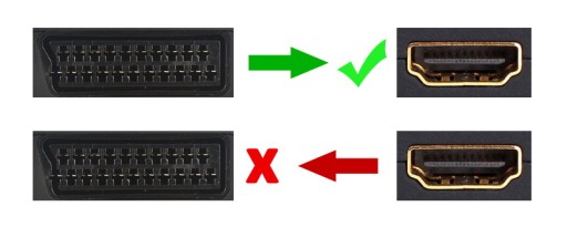 Podłączamy kabel Euro/Scart oraz kabel HDMI do adaptera. Następnie podłączamy kabel zasilania. Jeśli po kilku sekundach na telewizorze nie pojawi się obraz proszę odłączyć i ponownie podłączyć zasilanie adaptera i/lub wyłączyć i ponownie włączyć urządzenie będące źródłem obrazu