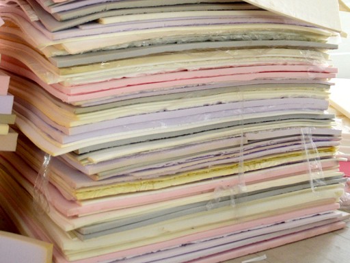 Pozostałości pianki tapicerskiej poliuretanowej z procesu rozkroju bloku piankowego, nasze arkusze z jednej strony posiadają piankę, druga strona pokryta jest cienką warstwą przezroczystej folii pozostałości te są matami idealnie nadającymi się do: