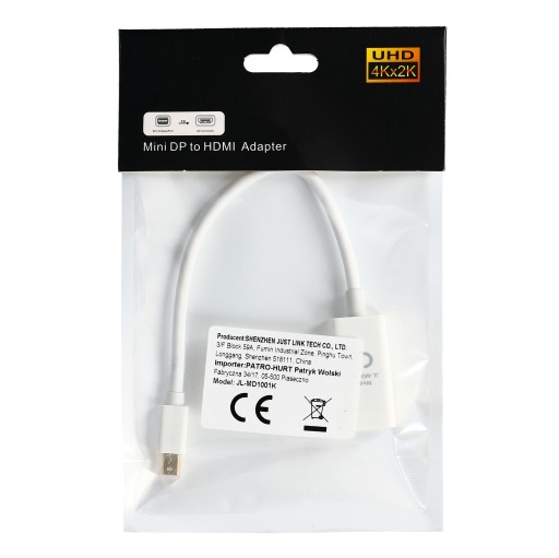 Adapter konwertuje sygnał z portu mini DisplayPort na wyjście HDMI o rozdzielczości do ULTRA HD 4K 3840x2160 @30Hz lub FULL HD 1080p @60Hz.