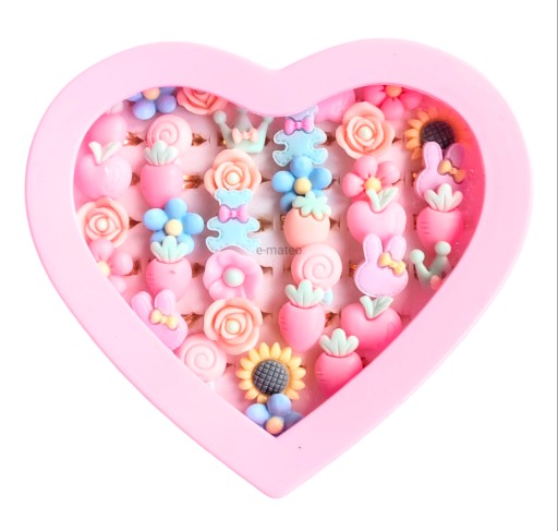 - 36 pierścionków z błyszczącymi elementami umieszczono w pudełeczku w kształcie serca.