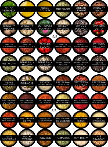 Dzięki czytelnym naklejkom z nazwami przypraw, wszystko jest na swoim miejscu, a Twoja kuchnia wygląda schludnie i profesjonalnie.