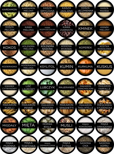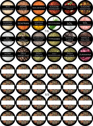 ✅ Zestaw zawiera 192 naklejki z nazwami przypraw, w tym 24 naklejki z pustym miejscem do wpisania dowolnego tekstu.