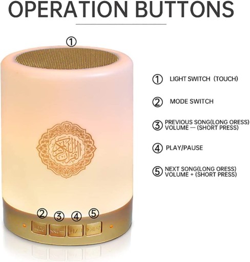 - Głośnik Bluetooth zaprojektowany specjalnie dla muzułmanów, z wbudowaną kartą TF o pojemności 8 GB, przez słynnego imama (obsługiwany przez 18 znanych recytatorów) i tłumaczenie na 14 różnych języków. Odtwarzanie Koranu słowo po słowie i łatwe uczyć się Koranu w ten sposób.