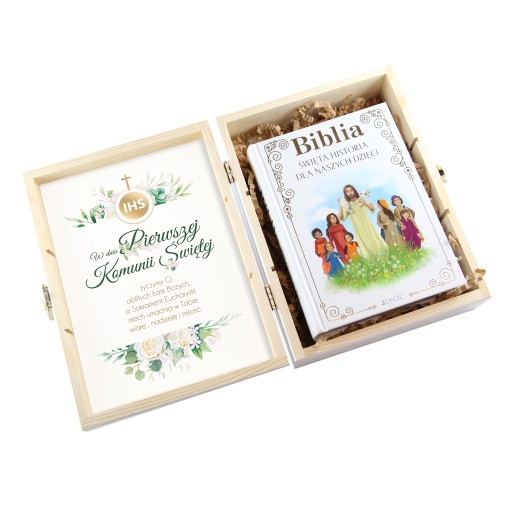 ⭐ Jeżeli szukasz pięknego i praktycznego prezentu na Pierwszą Komunię Świętą, wybierz biblie w białym personalizowanym pudełku.
