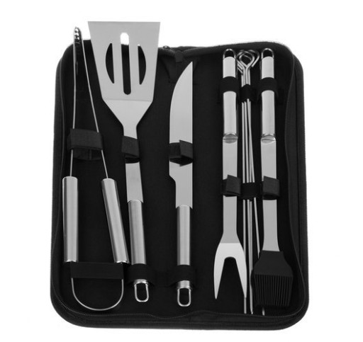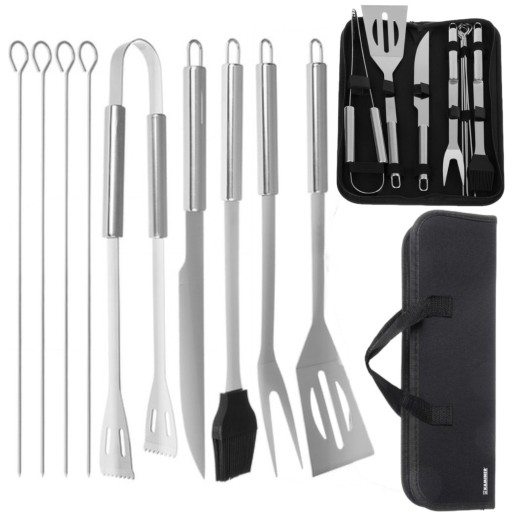 Zestaw przyborów do grilla zawiera wszystko, co jest niezbędne do amatorskiego i bardziej profesjonalnego grillowania. Znajdziemy tu ostry nóż, widelec, a także łopatkę, pędzel i szczypce. Oprócz tego w skład zestawu wchodzą również 4 szpikulce – idealne do przygotowania szaszłyków.