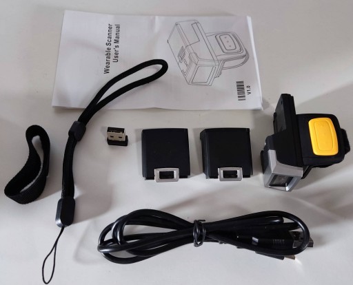 Zestaw zawiera: Smycz, 2x rzep na palec, 2x aku 600 mAh, kabel USB, stick 2.4G, skaner na palec 1D 2D, instrukcja obsługi