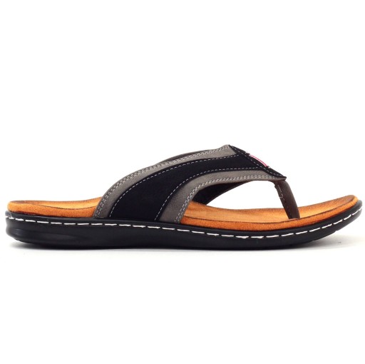 Męskie japonki w kolorze szaro-czarnym. Idealnie sprawdzą się jako obuwie na co dzień w ciepłe dni lub obuwie domowe. Miękka, profilowana wkładka zapewnia komfort użytkowania.Szyta podeszwa skutkuje dłuższą wytrzymałością. Prosty fason pasuje do wielu stylizacji.