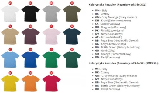 - Dostępne firmy koszulek to: JHK, Gildan oraz Malfini/Adler - firmy wysyłane są losowo