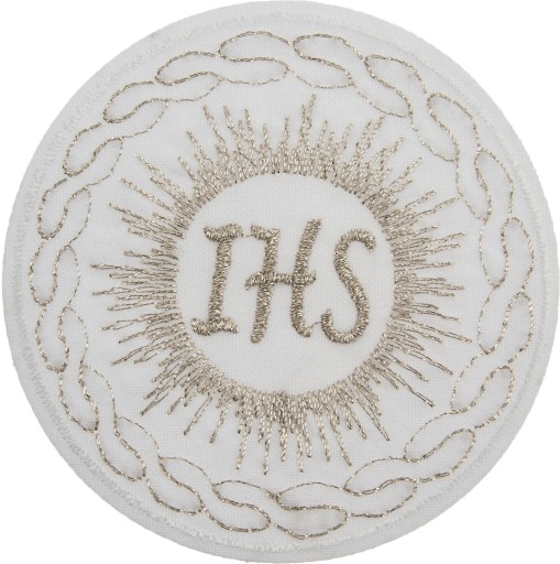 Ozdobna aplikacja w kształcie Hostii przeznaczona do przyszycia. Idealnie nadaje się na Chrzest, Pierwszą Komunię Świętą. Doskonała jako ozdoba kościelna. Bardzo starannie wykonana. Zrobiona z materiału odpowiedniego do prania w temperaturze 40 stopni. Od spodniej strony z minimalną ilością nitek od haftu. Bardzo cienka.