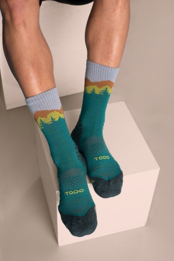 - Klasyczna wysokość skarpety, idealnie dopasowana do wyższych butów trekkingowych.