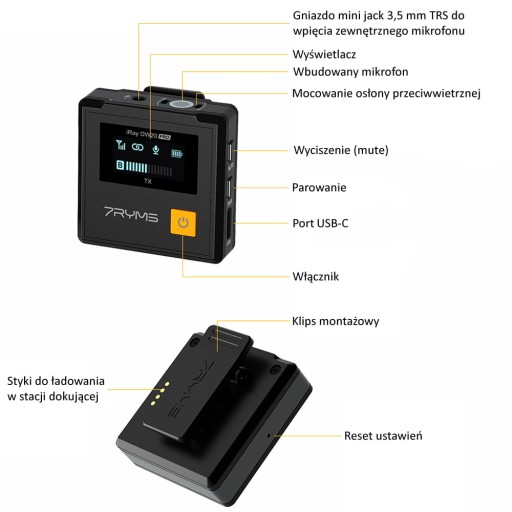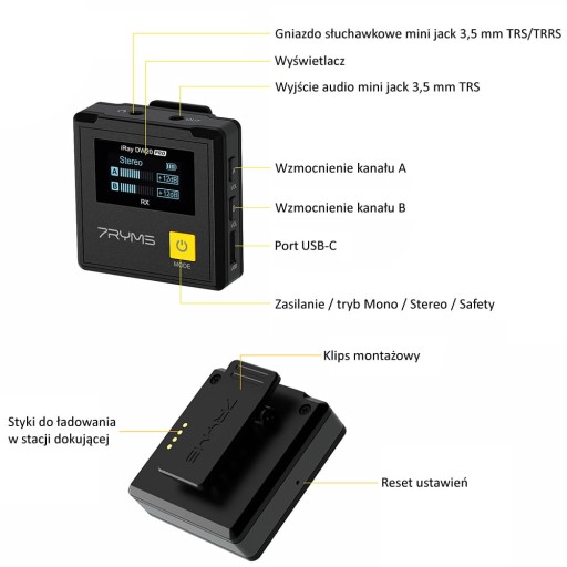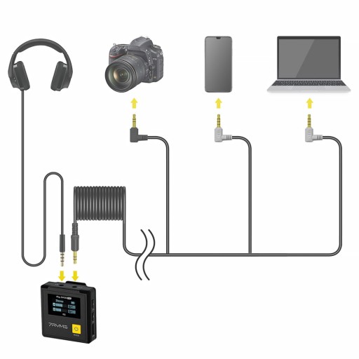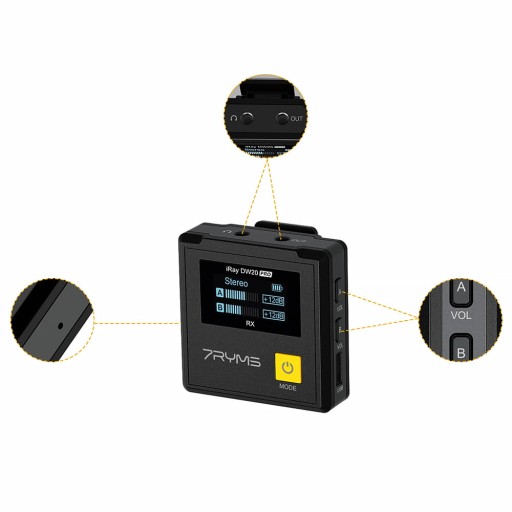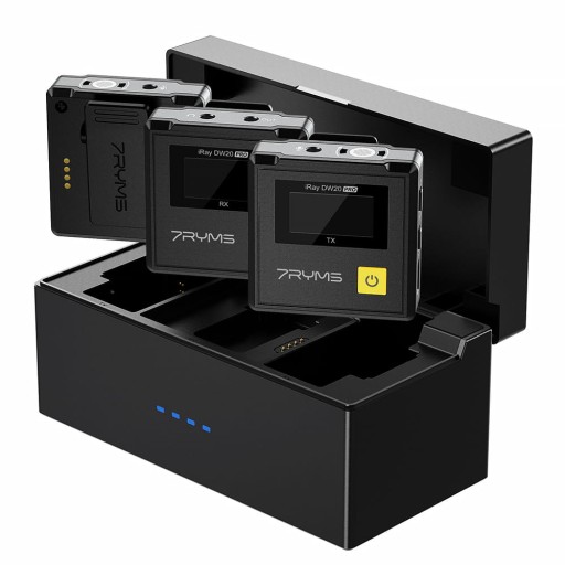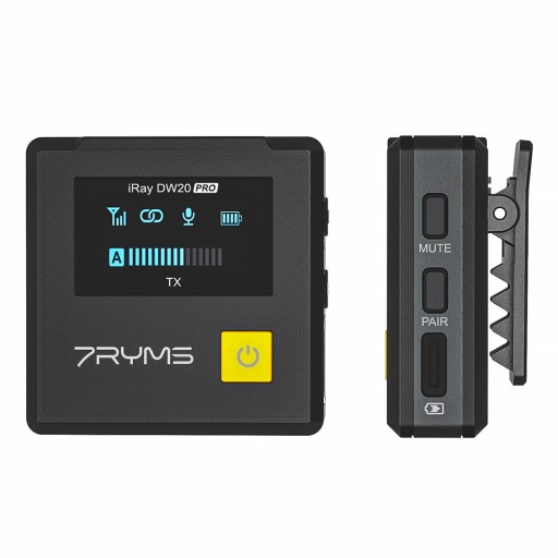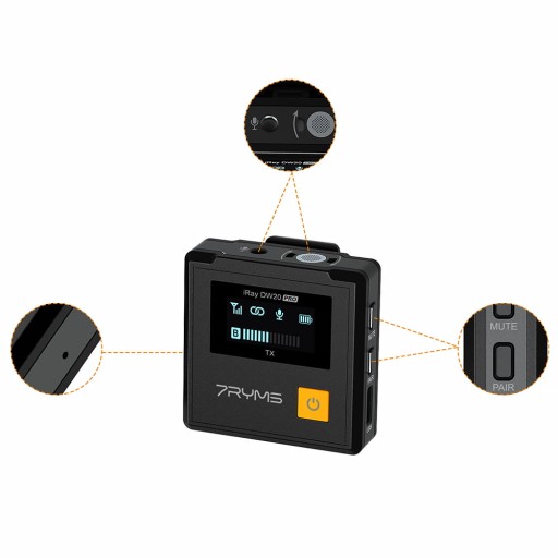 7Ryms iRay DW20 Pro to bezprzewodowy system mikrofonowy przeznaczony do pracy z urządzeniami z portem mini jack 3,5 mm – aparatami fotograficznymi, kamerami video, rejestratorami dźwięku, smartfonami i innymi urządzeniami mobilnymi. W zestawie znajdują się dwa wymienne kable – 3-pinowy TRS oraz 4-pinowy TRRS. Pozwala to na łączenie mikrofonów zarówno z urządzeniami posiadającymi oddzielne porty mikrofonowe i słuchawkowe, jak i z tymi wyposażonymi w port łączony.