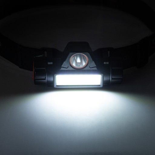 Nasza latarka wyposażona jest w dwa reflektory – szeroki i wąski. Wąski posiada 1 mocną diodę LED, która świeci na odległość aż 80 m,. Szeroki natomiast wyposażony w pasek COB z 16 diodami, który oświetla szeroki obszar do 10 m. Dzięki regulowanej opasce elastycznej można dopasować ją do każdego rozmiaru głowy oraz zabezpieczyć przed spadaniem. Promień światła można regulować nawet do 90°.