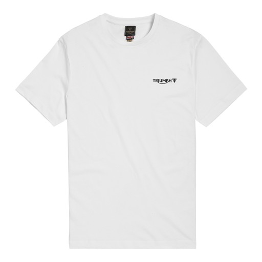 Klasyczna bawełniana koszulka o gramaturze 160g w kolorze białym z logo Triumph z przodu i charakterystyczną tkaną naszywką na dolnym brzegu.