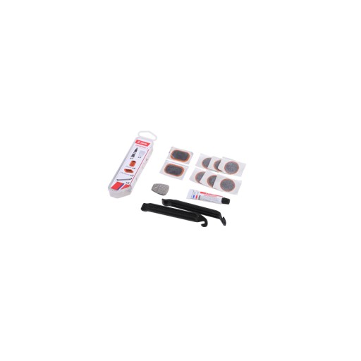 Zestaw naprawczy renomowanej, francuskiej marki Zefal. W zestawie znajdziemy 2 łyżki do opon wykonane z wytrzymałego tworzywa, tarkę, specjalny klej 5g, oraz 8 łatek w tym 6 okrągłych o średnicy 25mm, 1 o wymiarach 24 x 35mm, oraz 1 sztuka o rozmiarach 30 x 50mm. Całość zapakowana jest w małe i poręczne opakowanie wykonane z plastiku.
