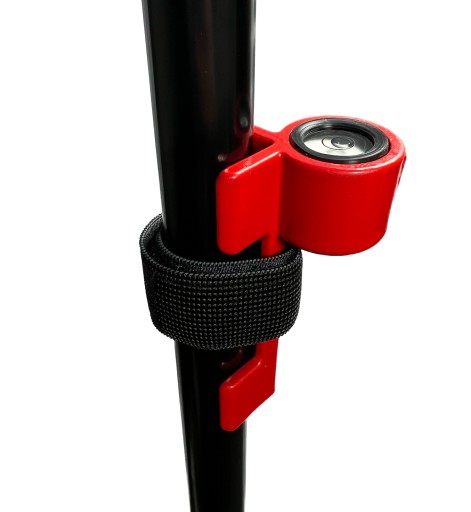 Zapobiega błędom w odczytach spowodowanych niezauważalnym pochyleniem. Dzięki elastycznej opasce z rzepami łatwo ją przyłożyć i zamontować. Można ją też naciągać, wtedy mocno i stabilnie trzyma się tyczki, łaty.