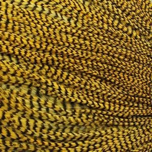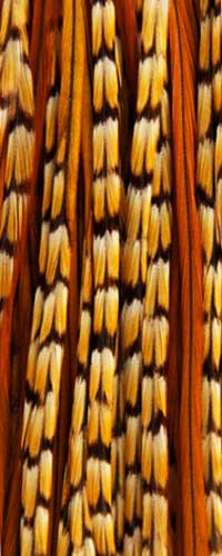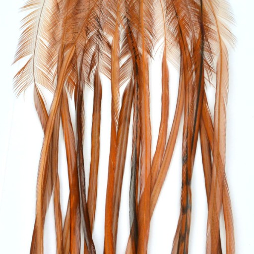 Pojedyncze, dokładni wyselekcjonowane pod względem rozmiaru i koloru, długie siodłowe piórka charakteryzują się przede wszystkim niemal idealnym równomiernym rozkładem promyków na całej długości piórka. W przeciwieństwie do wielu piórek, piórka te nie udają piórek danego rozmiaru, ale są piórkami o jednym rozmiarze na całej kilkudziesięciu centymetrowej długości! CAŁE piórko ma idealne promyczki, nie tylko krótki jego fragment. (Na giełdach sprzętu widujemy często „pióra genetyczne suche” które tylko na pierwszy rzut oka sa dobrymi piórami. W rzeczywistości sa to często długie śmieci, odpadki, piórka na kolczyki o fatalnym rozkładzie nierównomiernych promyków)