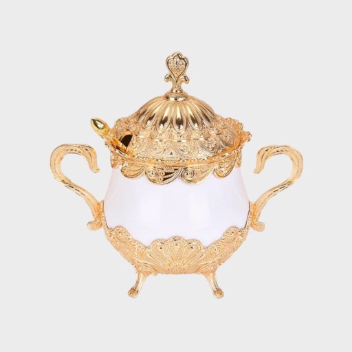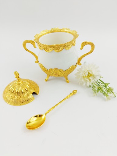 Cukiernica zdobiona metalowa z pokrywą i łyżeczką.