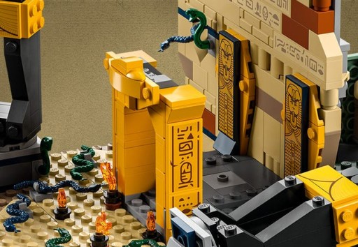 - Cztery minifigurki — Indiana Jones™ ze swoim słynnym kapeluszem i biczem, Marion Ravenwood™, Sallah™ i mumia. Jest też dużo węży: na podłodze i przechodzących przez ścianę