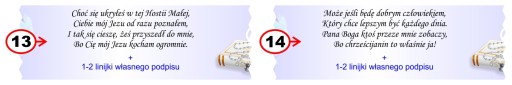 Do Jezusa wyciągnij ręce, / bo on Cię kocha najgoręcej, / Dziś Jezus oddał Ci się cały, / w tej świętej Hostii białej. / [1 - 2 LINIJKI TWOJEGO PODPISU]