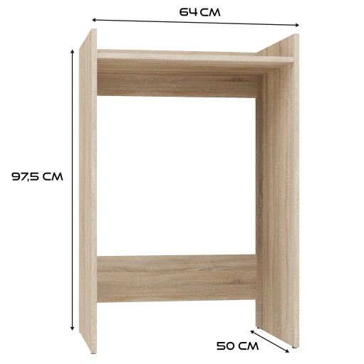WYMIARY: Szerokość całkowita: 64 cm Wysokość całkowita: 97,5 cm Głębokość całkowita: 50 cm Odległość ziemi do blatu: 88,7 cm Wysokość od blatu do góry: 7,2 cm Użytkowanie: Powierzchnię mebla czyścić przy pomocy miękkiej szmatki. Unikać stosowania silnie działających środków chemicznych. W opakowaniu: Instrukcja montażu wraz ze wszystkimi potrzebnymi akcesoriami montażowymi. Meble są fabrycznie zapakowane do samodzielnego montażu. Pozostałe szczegółowe wymiary znajdują się poniżej w zakładce "Pliki" w postaci arkusza kalkulacyjnego.