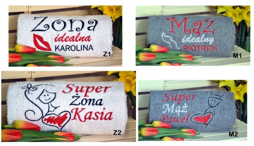 Przedmiotem aukcji jest gotowy prezent - komplet dwóch ręczników o wymiarach 70cm x 140cm z indywidualnym haftem. Gotowe ręczniki pakujemy w eleganckie pudełko z okienkiem oraz ozdabiamy taśmą i naklejką. Zestaw może być idealnym prezentem na Święta, Mikołajki, urodziny, imieniny ślub, dzień babci, dziadka, Walentynki oraz wiele innych okazji. Wyhaftować możemy napis składający się z kilku słów, daty, obrazka. Możemy wyhaftować projekt z naszej galerii lub Państwa własny.